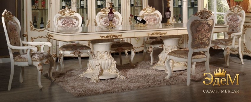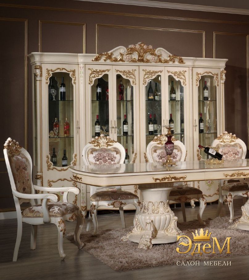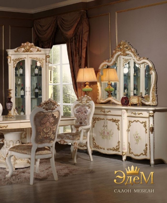 Нежная и утонченная гостиная и столовая Baticella, одновременно, богатая и пышная. Но эта мебель лишена чрезмерной классической витиеватости – она поистине аристократична и элегантна. Изысканный гарнитур состоит из витрин, горки напольной, раздвижного стола со стульями и креслами. Художественная резьба покрыта «золотом», а фасады предметов вручную расписаны искусным декором в цветочном мотиве. В цветочной вариации так же были подобраны и обивочные ткани, восхищающие своей дорогой фактурой и насыщенными тонами. Нежное патинирование цветочков на декоре корон и стульчиках изящно сочетается с росписью ручной работы на фасадах. Фурнитура деликатно украшена стразами. Эргономичность и функциональность гостиной и столовой Baticella позволяет установить ее в любом помещении – от квартиры до загородного особняка, привнеся в пространство комфортный, уютный и богемный интерьер.